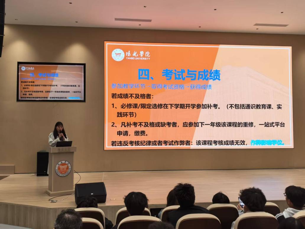 宣讲不仅明晰规则,更注重价值引领与成长赋能。肖老师结合真实案例,重点强调了学术诚信的底线与考试纪律的严肃性,提醒新生务必“遵守校规校纪、坚守道德底线”,树立“敬畏规则、诚信治学”的自觉意识。同时,学院构建的制度体系也充分体现了对学生个性化发展的支持。一方面,通过明确的学业预警与帮扶机制,为学生学业平稳推进提供保障;另一方面,积极拓展多元化发展路径。肖老师详细解读了将学科竞赛获奖、创新创业实践、职业资格认证等成果纳入学分认定的置换政策,鼓励同学们将理论联系实际,激发创新精神与实践动力。